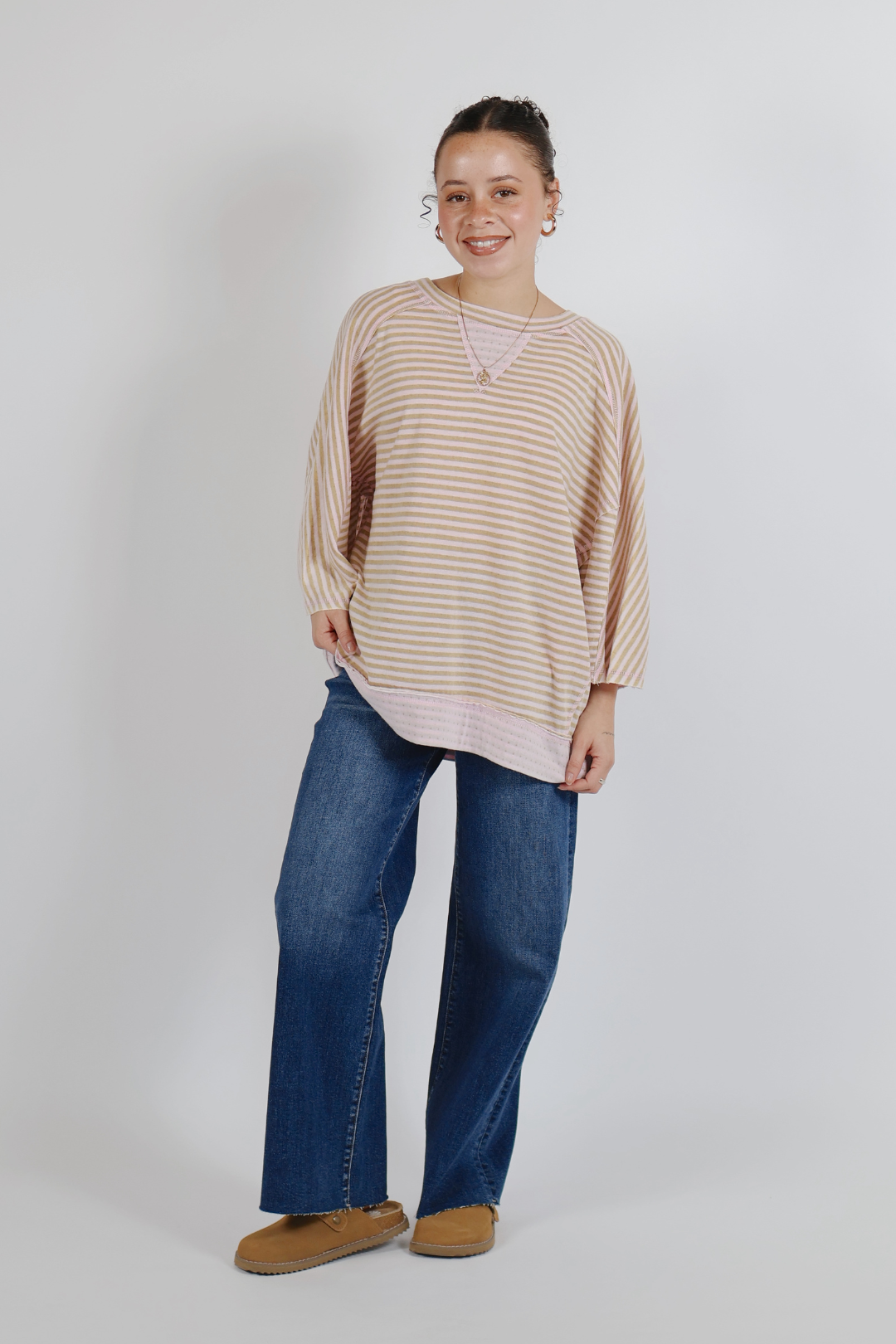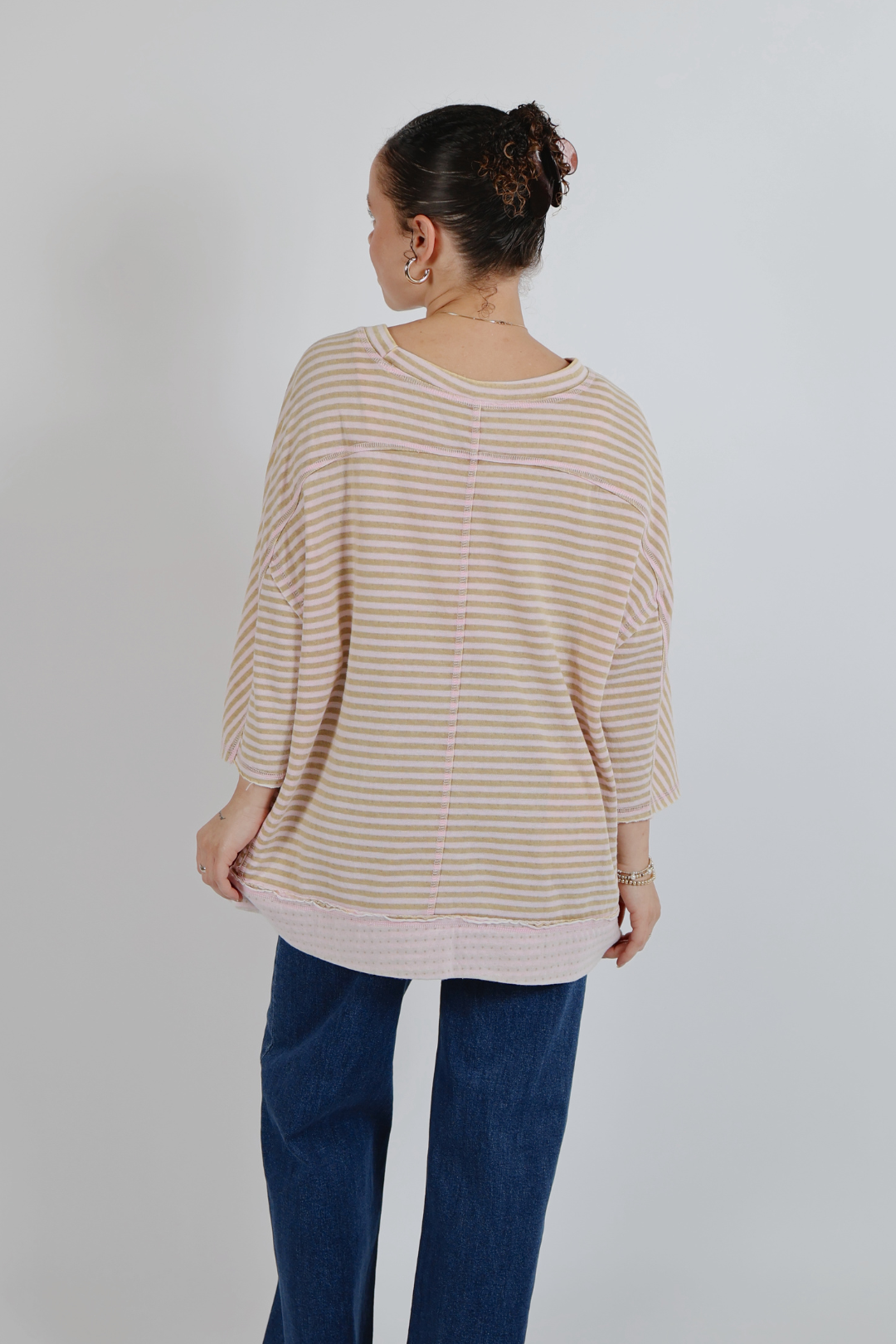 Le pull Blush Breeze Boxy Knit allie confort décontracté et charme vintage espiègle. Confectionné en maille délavée aux minéraux, ce pull oversize présente un corps à rayures douces, un ourlet et un col contrastés à pois, ainsi qu'un empiècement triangulaire original qui lui confère une touche d'originalité. Sa coupe ample et décontractée et ses manches 3/4 en font le vêtement idéal pour les journées casual, les looks du week-end ou à associer à votre jean et votre jogging préférés. Léger, respirant et irrésistiblement mignon, c'est une pièce incontournable en toute saison.