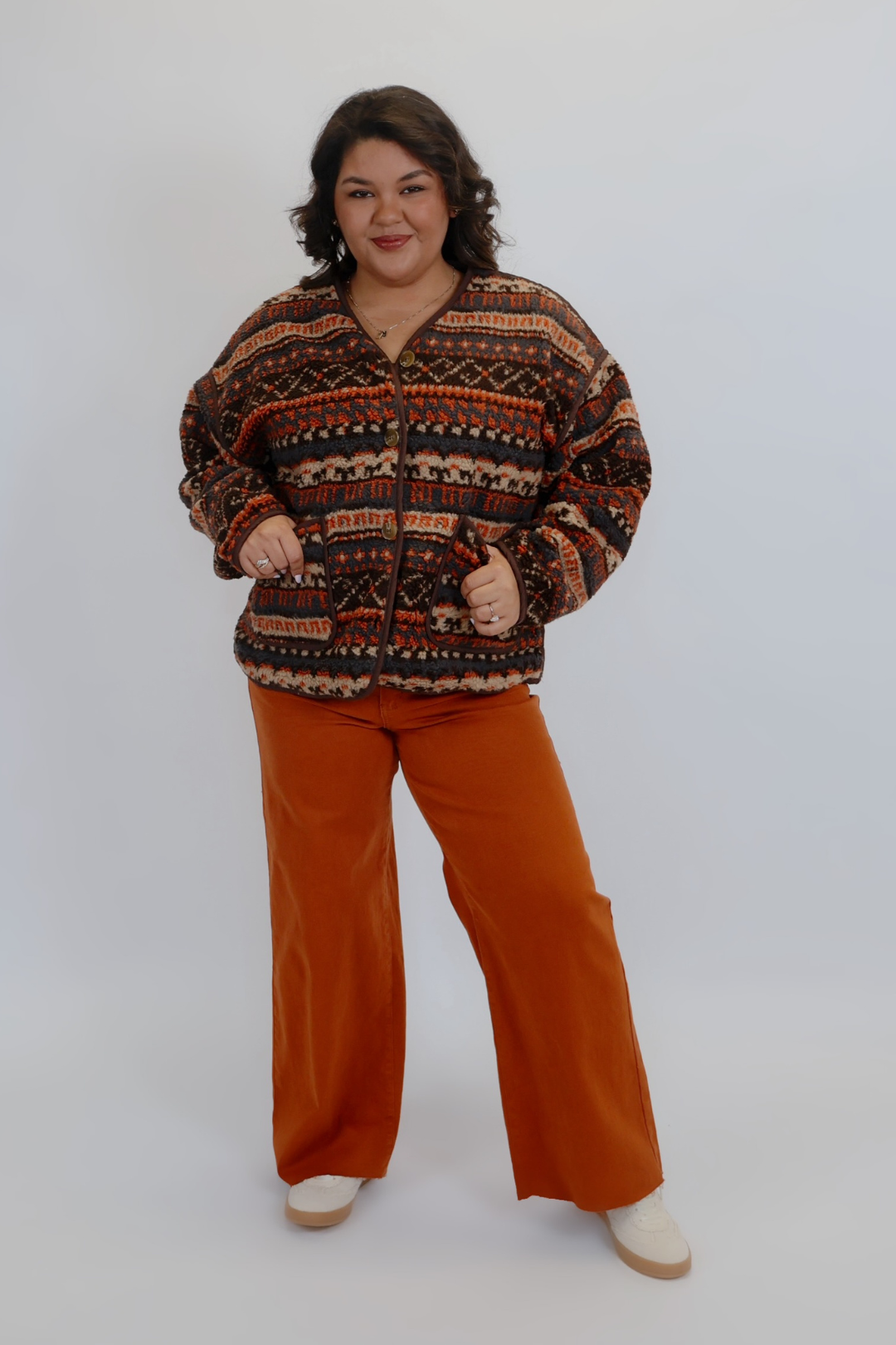L'aventure rencontre le confort avec notre veste Desert Trails à écusson aztèque. Cette veste boutonnée en maille, au style affirmé, arbore des écussons aztèques audacieux et des finitions contrastées pour un mélange parfait de charme western et de confort au quotidien. Conçue avec des poches plaquées sur le devant et une doublure douce, elle est aussi fonctionnelle qu'élégante : idéale pour superposer les vêtements par temps frais.