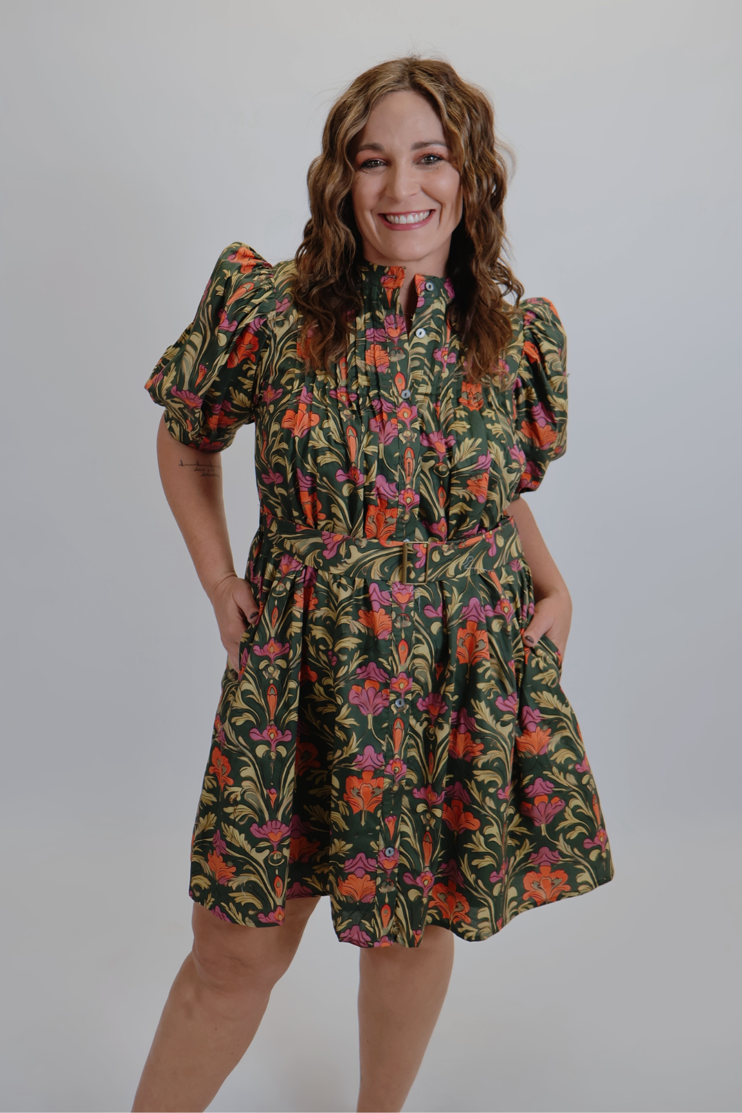 Faites sensation avec la mini-robe ceinturée Garden Charm, une pièce forte ornée d'imprimés botaniques éclatants. Dotée de manches bouffantes et de délicats plis sur le devant, cette mini-robe dégage un charme féminin empreint de sophistication. La ceinture à boucle assortie souligne la taille pour une silhouette flatteuse, tandis que la fermeture boutonnée et les poches latérales ajoutent une touche pratique. Confectionnée en 100 % coton, cette robe doublée, opaque et légère est idéale pour être portée toute la journée, du brunch aux promenades en soirée.