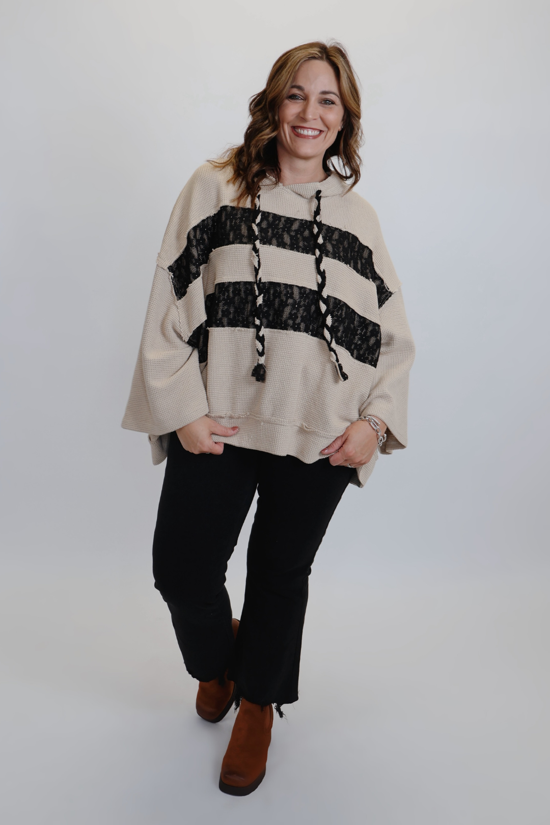 Le sweat à capuche Lace Dreams en maille gaufrée allie confort et élégance. Un indispensable décontracté avec une touche romantique. Conçu dans une coupe ample et confortable avec des manches trois-quarts, ce modèle doux en maille 100 % coton est orné de jolis empiècements en dentelle qui apportent une note féminine à son style décontracté. Les cordons tressés, les coutures à bords francs et la finition délavée vintage lui confèrent ce look décontracté que vous allez adorer.