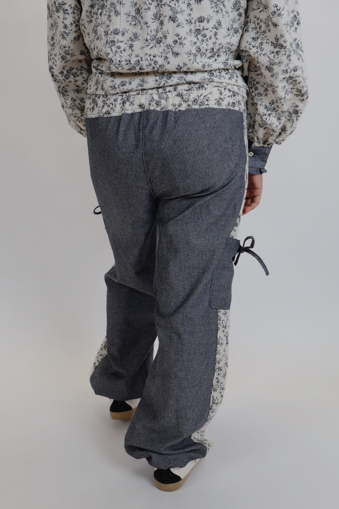 Adoptez un style décontracté avec le pantalon cargo Petal Patch ! Confectionné dans un tissu à fines rayures délavé et rehaussé d'empiècements floraux éclatants, ce pantalon apporte une touche d'originalité à votre garde-robe. Grâce à ses poches cargo latérales pratiques et à ses liens ajustables à la taille et aux ourlets, vous pouvez personnaliser votre coupe tout en conservant un look décontracté et tendance. Parfait pour les journées où confort et style se conjuguent, ce pantalon insuffle une allure fraîche et décontractée à toutes vos tenues. Le mannequin porte une taille M. Couleur : Denim Blossom. 70 % coton / 30 % lin.