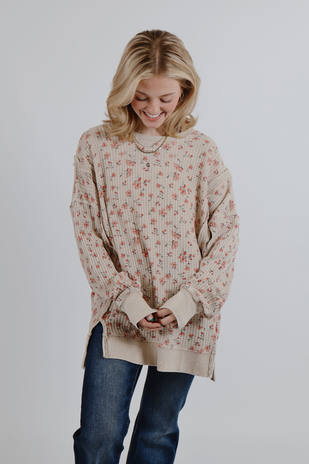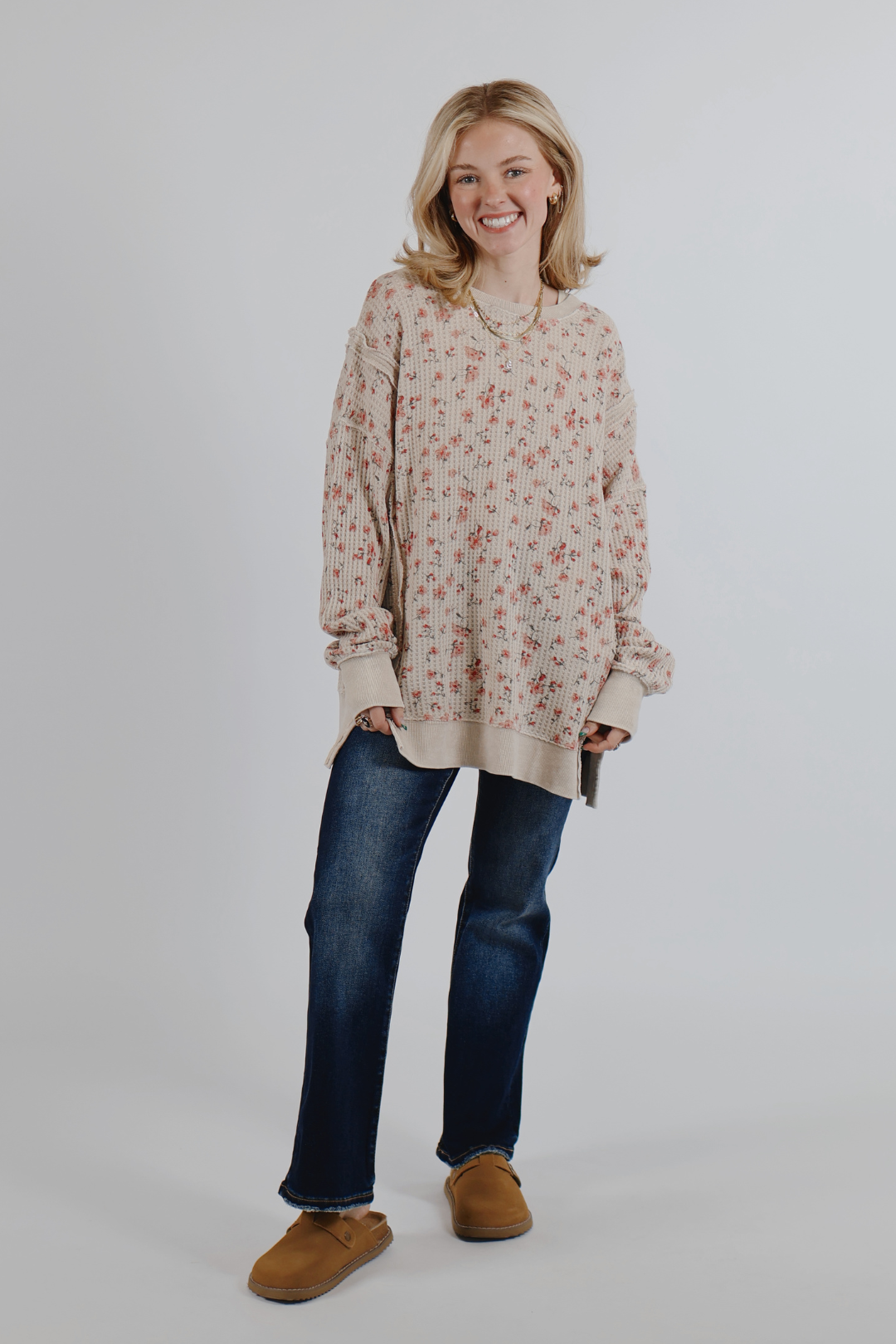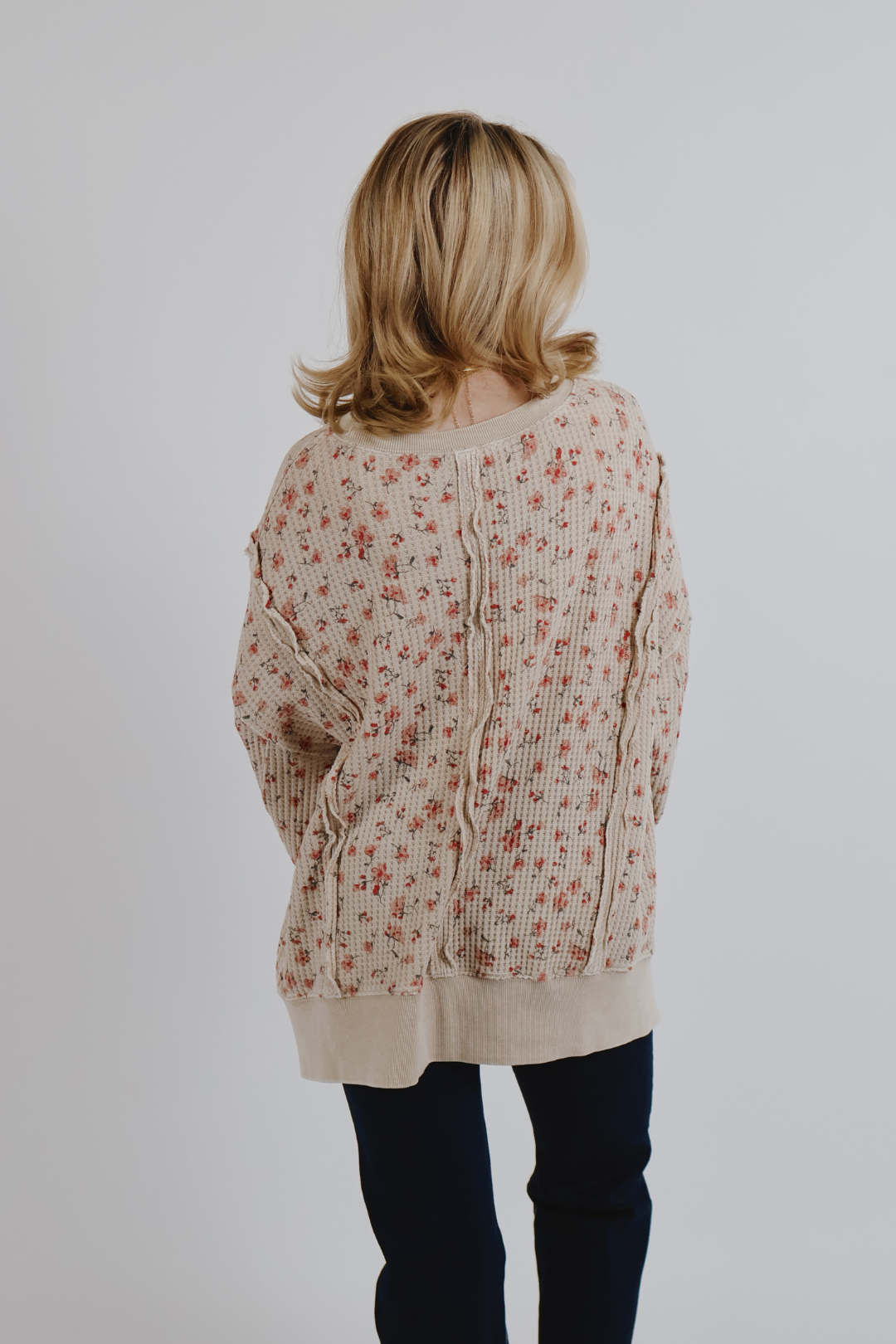 Le pull thermique Petal Path allie à la perfection confort douillet et charme féminin. Confectionné dans une maille gaufrée douce et texturée, ce pull délavé aux minéraux arbore un imprimé floral discret qui lui confère une touche douce et vintage. Sa coupe ample et décontractée est mise en valeur par des coutures apparentes, des épaules tombantes et des fentes latérales pour une liberté de mouvement optimale et un style facile à porter. Associez-le à un jean, un legging ou un pantalon de détente pour un look quotidien à la fois confortable et sophistiqué.