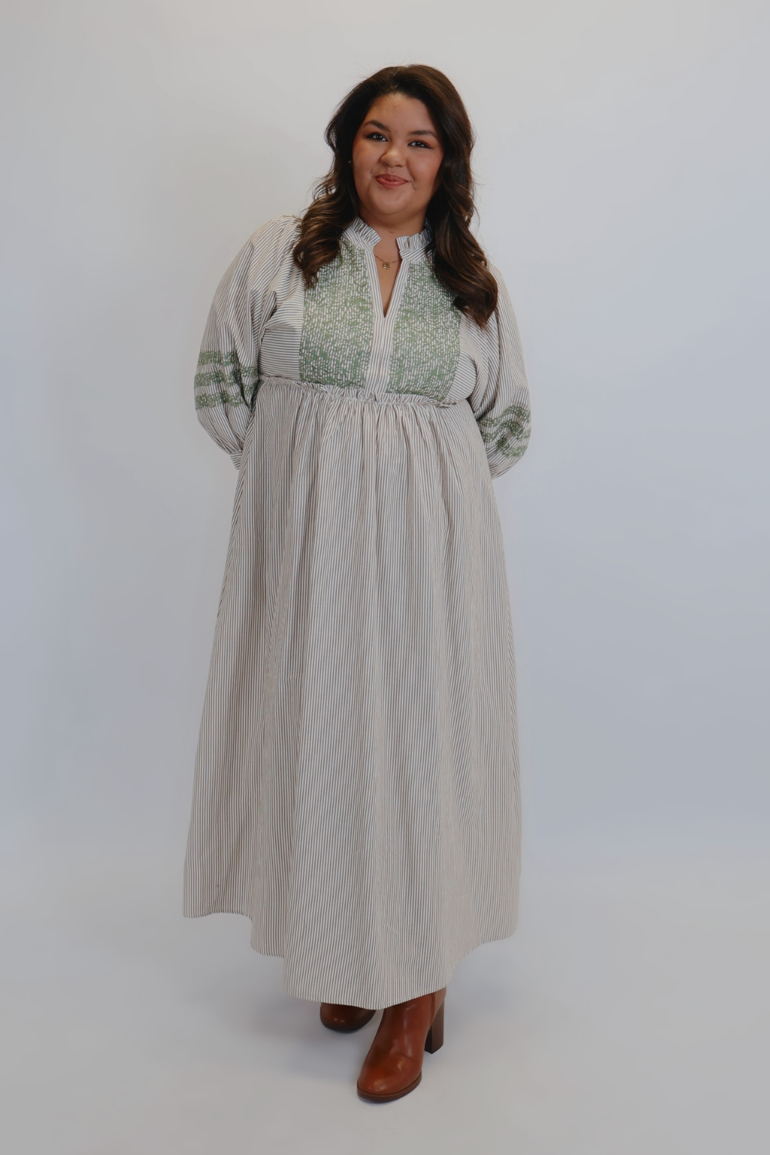 Romantique et d'un style bohème décontracté, notre robe midi brodée Prairie Bloom allie charme intemporel et confort moderne. Dotée de manches bouffantes 3/4, d'un décolleté légèrement volanté et de broderies délicates sur le corsage et les manches, cette robe midi à rayures se distingue par ses détails raffinés. Sa coupe décontractée et son tissu léger en font la robe idéale pour toutes les occasions, du brunch entre amis aux marchés d'automne.