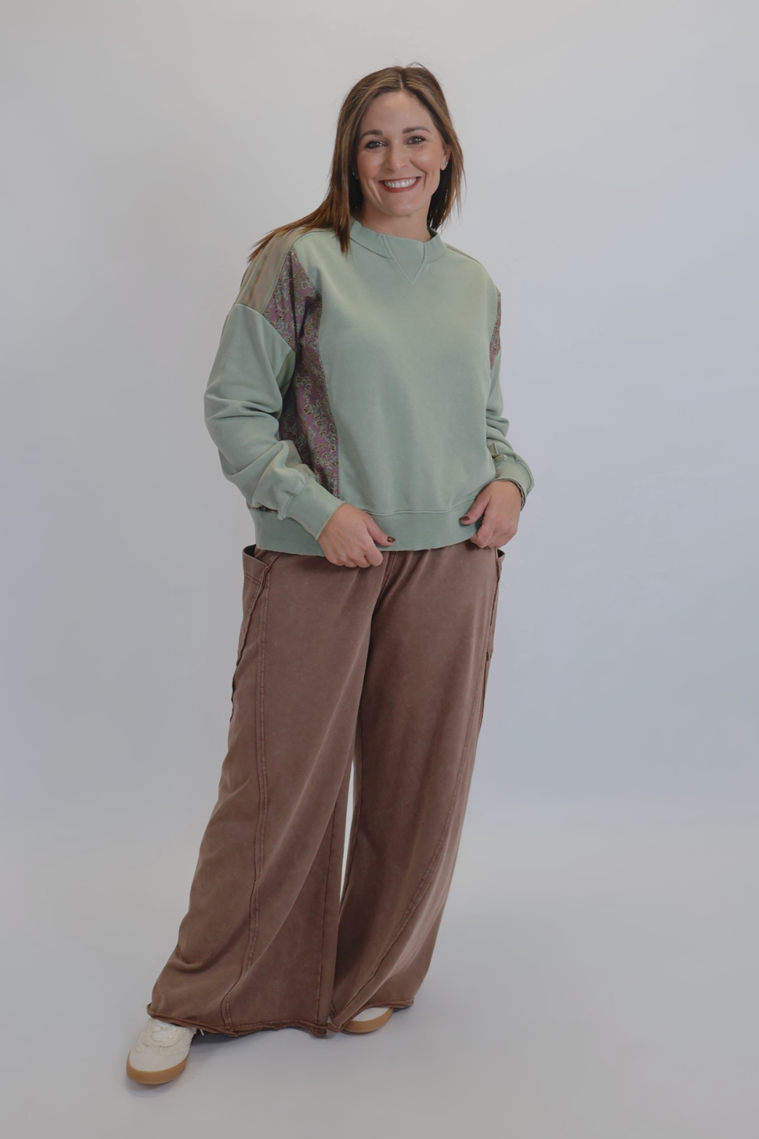 Le pull Sage Patchwork Dream allie charme vintage et confort douillet. Ce modèle unique, confectionné en tissu mixte, associe un molleton de coton doux à des empiècements contrastés à rayures et motifs cachemire, pour un style bohème inimitable. Un délavage minéral subtil lui confère un aspect parfaitement usé, tandis que l'encolure ronde côtelée avec empiècement en V et épaules tombantes apportent une touche décontractée et naturelle.