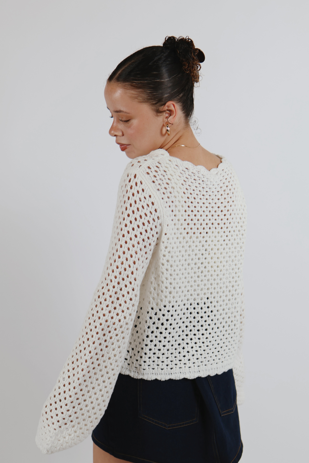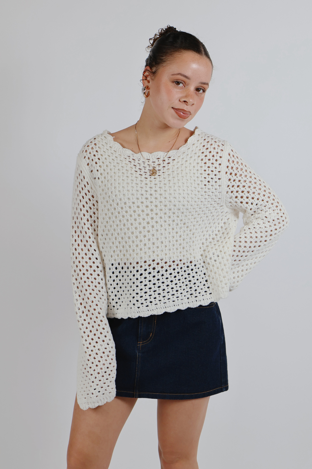 Léger, aérien et d'une féminité naturelle, le pull Soft Horizon Crochet est la pièce idéale à superposer pour les journées chaudes et les soirées fraîches. Conçu avec une texture crochetée ajourée et respirante, ce pull présente une délicate bordure festonnée le long de l'encolure et des poignets pour une finition douce et romantique. Ses manches longues décontractées et sa coupe légèrement courte et carrée créent une silhouette flatteuse et facile à porter, à la fois moderne et intemporelle.
