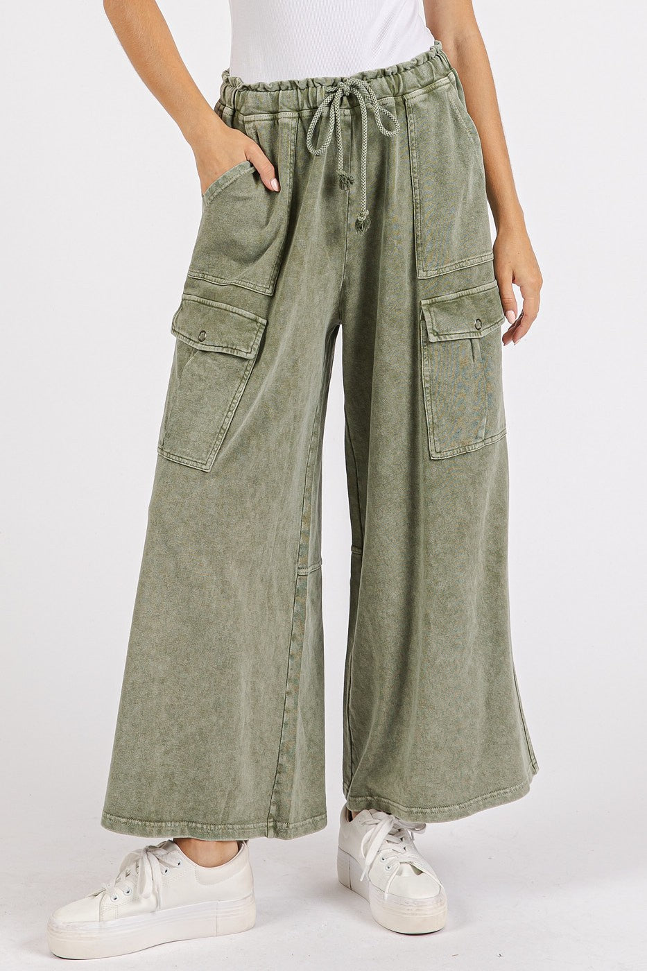 Une ceinture élastique recouverte avec cordon de serrage ajustable assure un confort optimal tout au long de la journée, tandis que les poches latérales et les poches cargo à rabat offrent un espace de rangement pratique. Les coutures apparentes complètent le style décontracté et bohème de ce pantalon, qui se marie facilement avec des débardeurs, des t-shirts et des vêtements légers.
