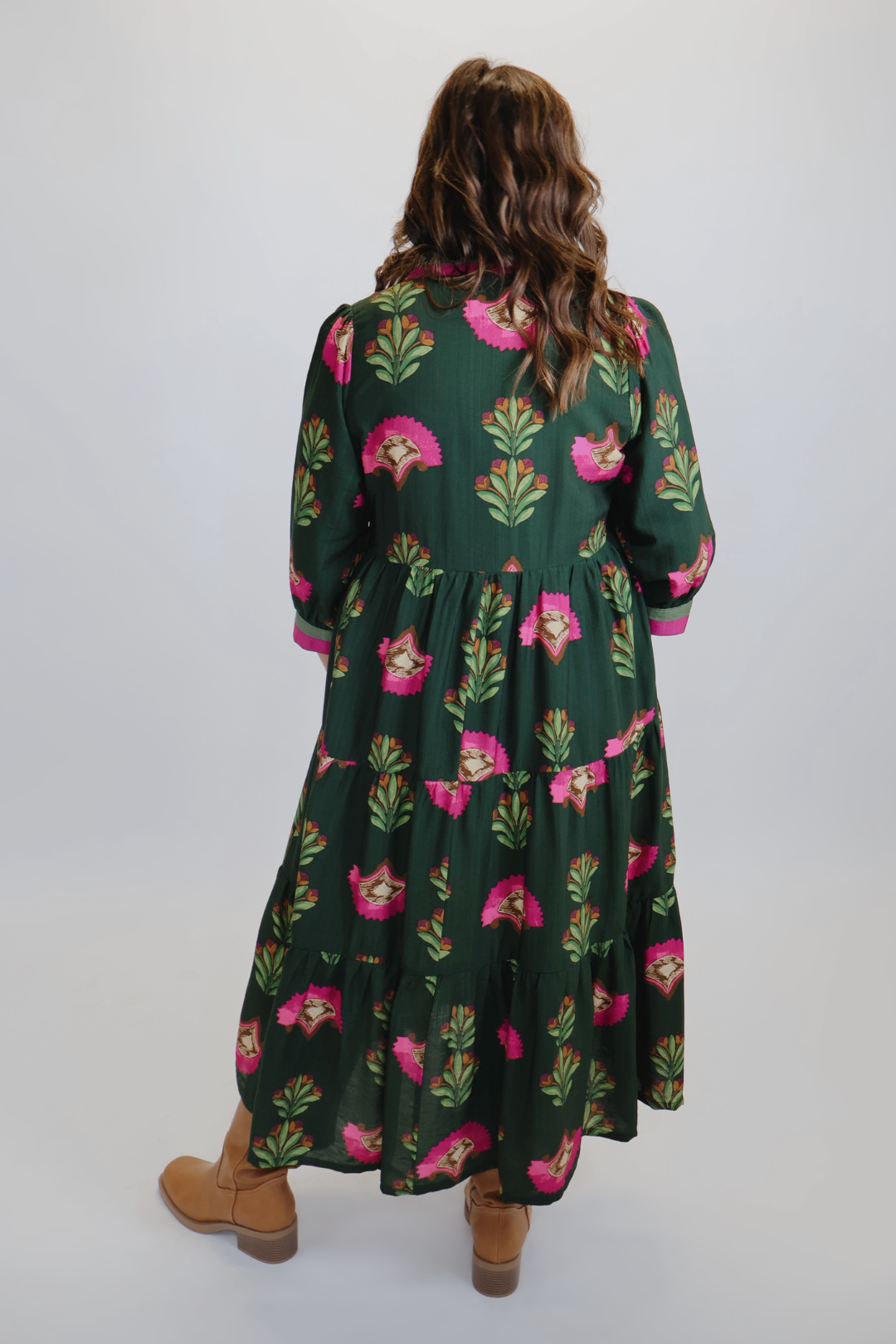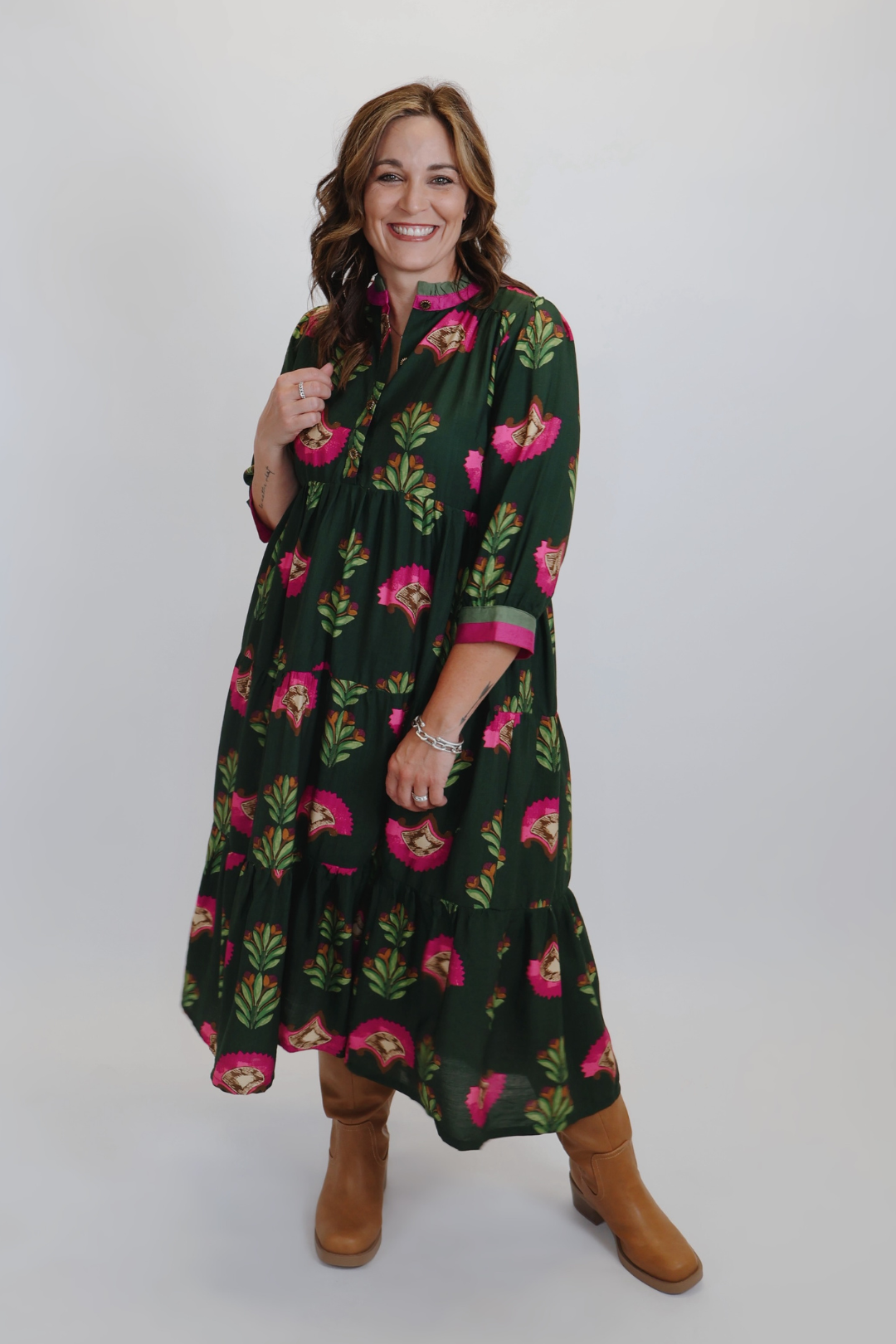 Ajoutez une touche d'élégance naturelle à votre garde-robe avec la robe midi à volants Wild Bloom. Ornée de fleurs audacieuses et captivantes et de finitions contrastées, cette robe est conçue pour vous faire remarquer tout en vous assurant confort et style.